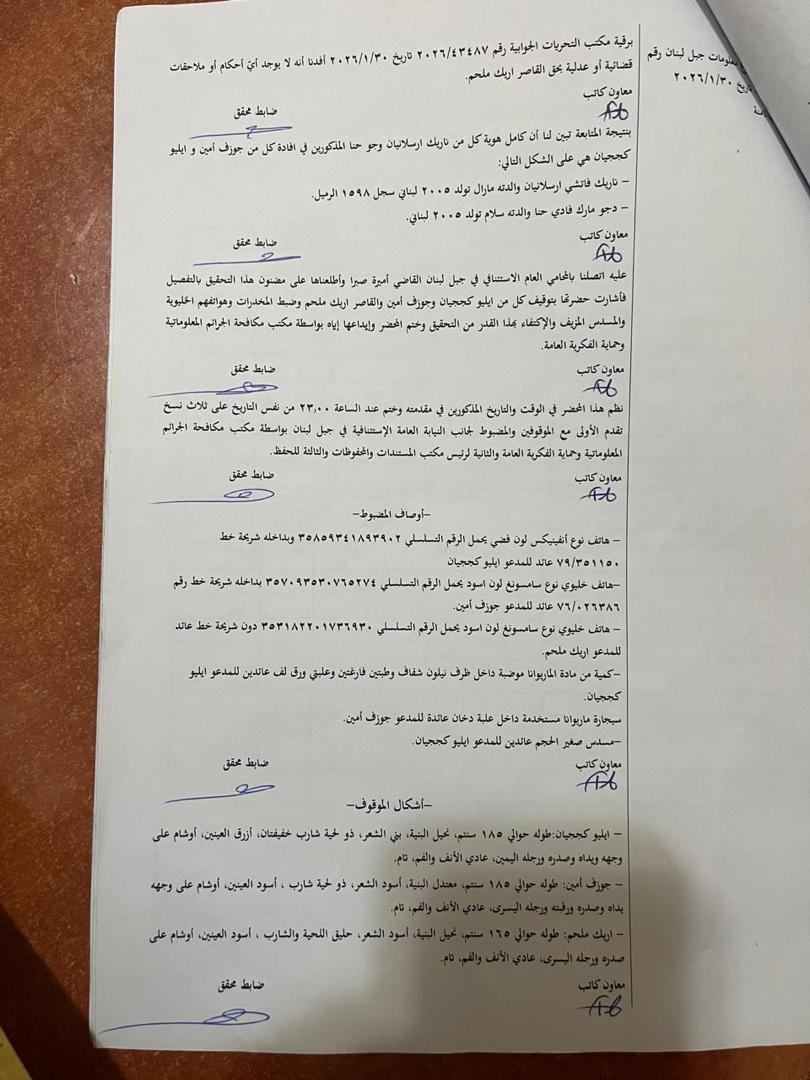 وبإشارة المحامية العامة الاستئنافية في جبل لبنان القاضية أميرة صبرا، جرى توقيف (ا.ك)، (ج.ا) والقاصر (ا.م)، وضُبطت هواتفهم الخلوية، إضافة إلى كمية من مادة الماريوانا ومستعملاتها، كما ضُبط بحوزة أحدهم مسدس صغير الحجم، وتم اتخاذ الإجراءات القانونية اللازمة بحقهم.