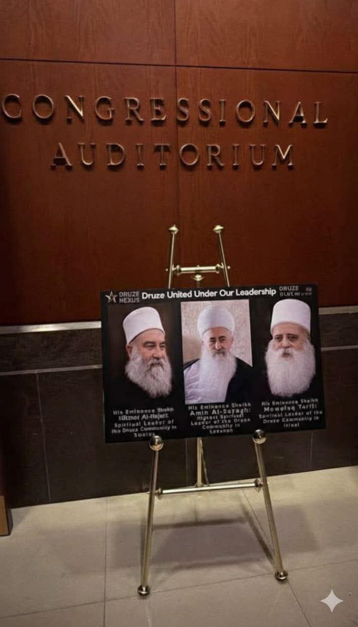 وفي خطوة غير مسبوقة، رُفعت صور المرجع الروحي الأعلى لطائفة الموحدين الدروز في لبنان الشيخ أمين الصايغ، والرئيس الروحي لدروز سوريا الشيخ حكمت الهجري، والرئيس الروحي لدروز إسرائيل الشيخ موفق طريف، داخل مبنى الكونغرس الأميركي.