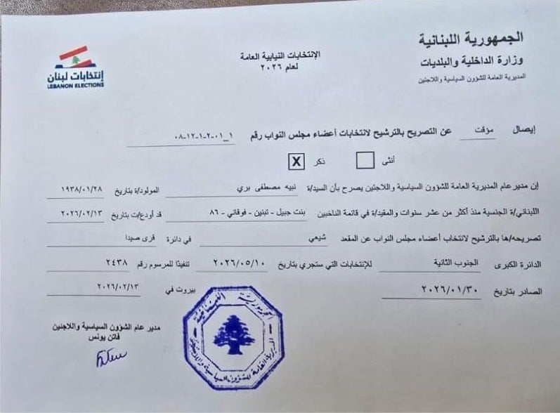 أفادت معلومات "ليبانون ديبايت" أن رئيس مجلس النواب نبيه بري والنائب قبلان قبلان كانا أول من قدّما طلبَي ترشيحهما رسميًا للانتخابات النيابية المقبلة، في خطوة مبكرة تعكس انطلاق العدّ العكسي للاستحقاق البرلماني المنتظر.
