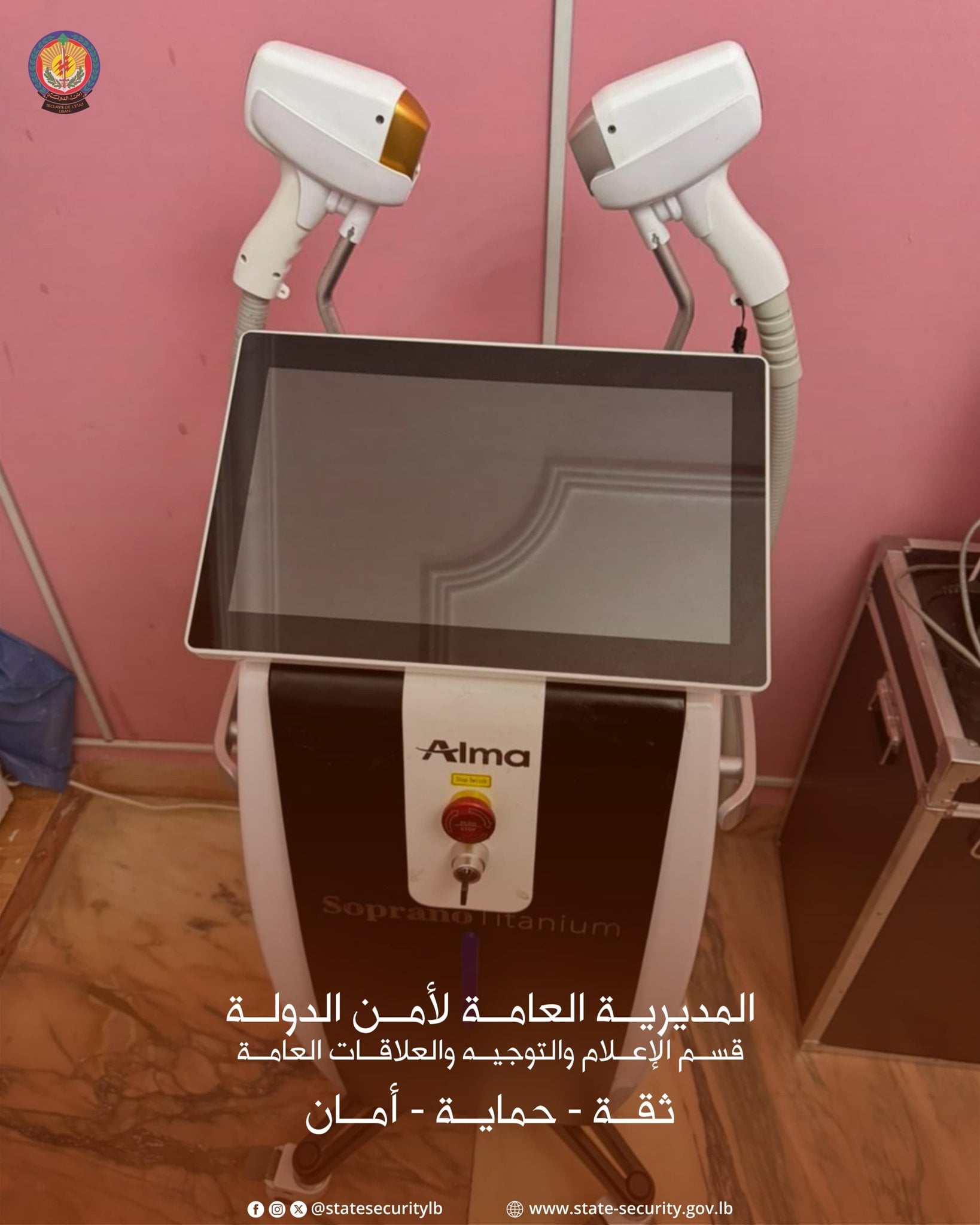 وأضاف، وقد جرى ضبط ثلاث ماكينات ليزر وماكينة لشفط الدهون مجهولة المصدر، تُستخدم لعلاج البشرة والتنحيف، إضافة إلى كمية من الإبر وعبوات الفيلر والبوتوكس مهربة وغير مرخّصة من قبل وزارة الصحة.
