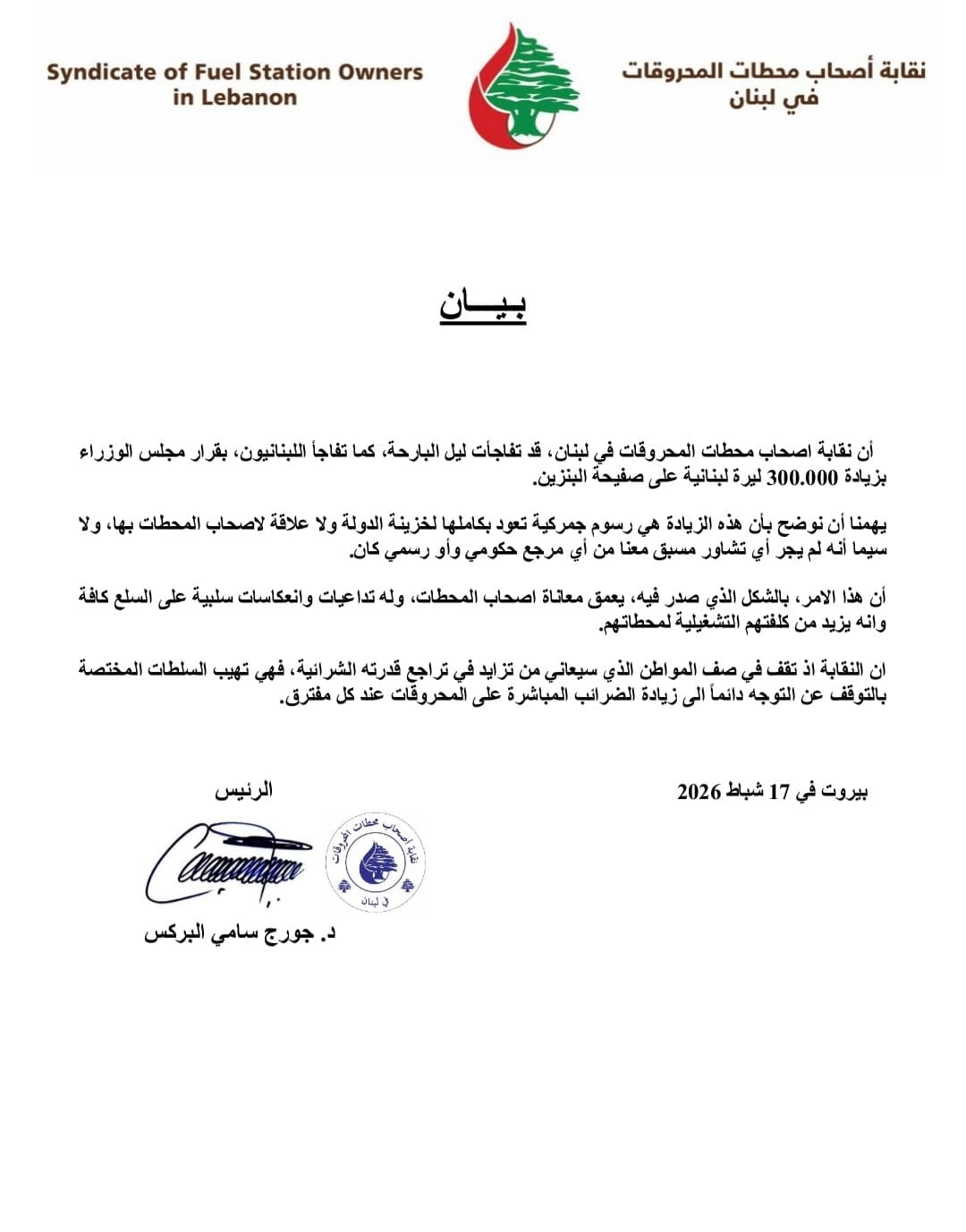 صدر بيان عن نقيب أصحاب محطات المحروقات في لبنان جورج البركس أوضح فيه أن نقابة أصحاب محطات المحروقات في لبنان تفاجأت، كما اللبنانيون، بقرار مجلس الوزراء زيادة 300.000 ليرة لبنانية على صفيحة البنزين.