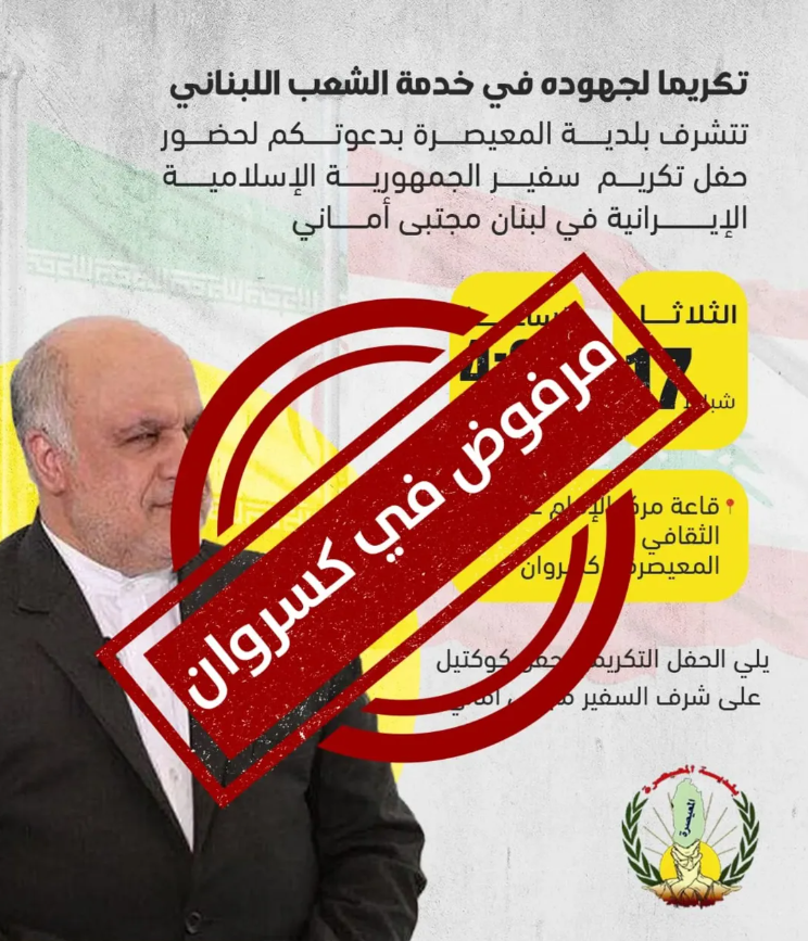 أثار الإعلان عن تنظيم حفل تكريم لسفير الجمهورية الإسلامية الإيرانية في لبنان، بدعوة من بلدية المعيصرة في قضاء كسروان، موجة اعتراض واسعة في المنطقة، تُرجمت بحملة رفض تحت شعار "مرفوض في كسروان"، وسط تحذيرات من تداعيات أمنية، واتهامات بتعريض الأهالي لمخاطر لا قدرة لهم على تحمّلها.