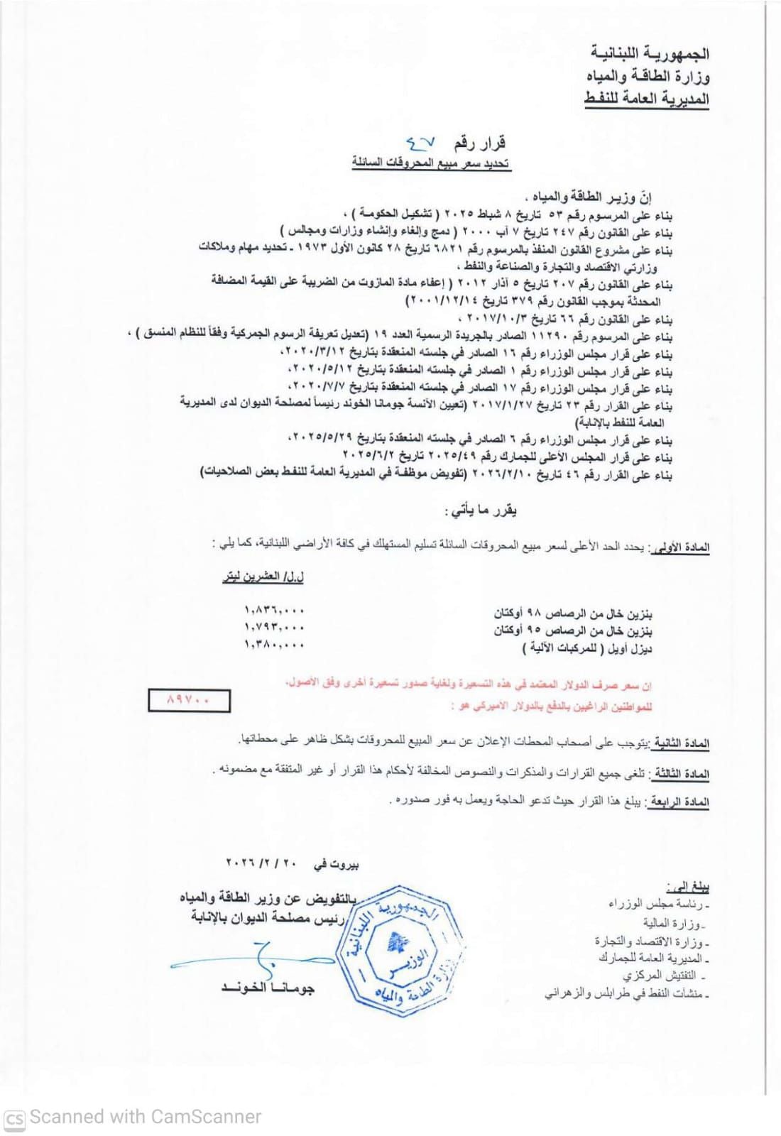 ارتفعت أسعار المحروقات مجدداً اليوم، 20-2-2026، لتُسجّل اللائحة الجديدة الأرقام الآتية: