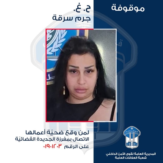 أصدرت المديرية العامة لقوى الأمن الداخلي بيانًا أعلنت فيه تعميم صورة موقوفة بجرم سرقة مجوهرات بطريقة احتيالية، داعيةً كل من وقع ضحية أفعالها إلى التقدم والإبلاغ.