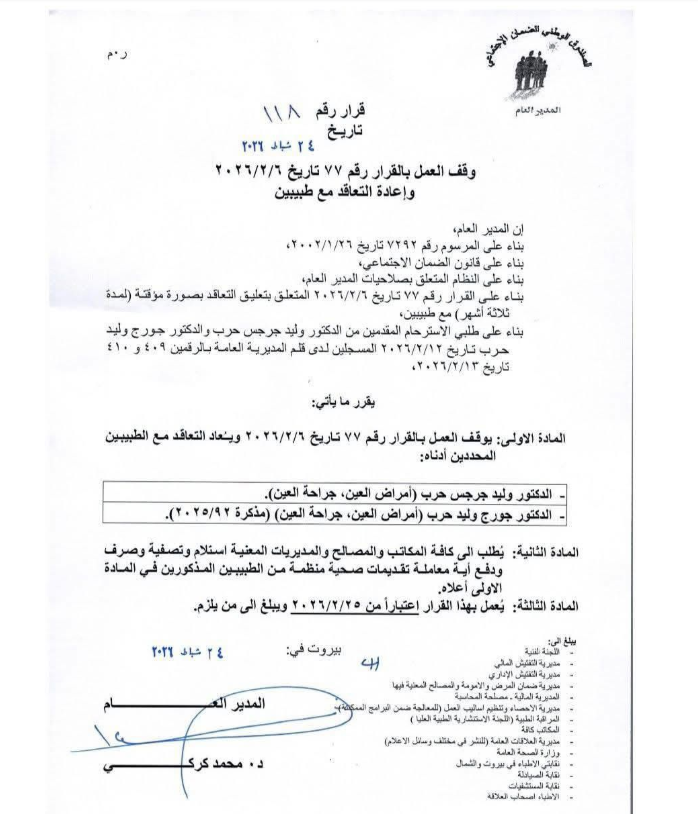 وختم بالإشارة إلى، أنّ "إعادة التعاقد أعادت الأمور إلى مسارها الطبيعي، بما يضمن استمرار تقديم الخدمات الصحية للمضمونين من دون أي انقطاع".