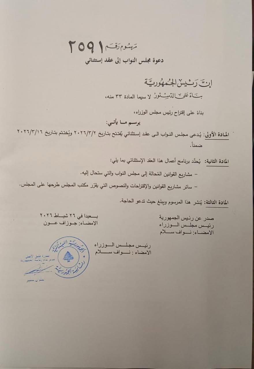 وجاء في المرسوم، الصادر استنادًا إلى المادة 33 من الدستور وبناءً على اقتراح رئيس مجلس الوزراء، أنّ برنامج أعمال العقد الاستثنائي يشمل مشاريع القوانين المُحالة إلى مجلس النواب والتي ستُحال إليه، إضافة إلى سائر مشاريع القوانين والاقتراحات والنصوص التي يقرّر مكتب المجلس طرحها على الهيئة العامة. كما نصّ على نشره وتبليغه حيث تدعو الحاجة، وقد صدر في بعبدا بتاريخ 26 شباط 2026، ممهورًا بتوقيع رئيس الجمهورية ورئيس مجلس الوزراء.