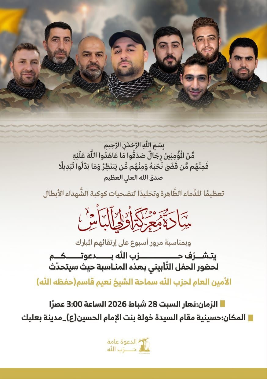 يُلقي الأمين العام لحزب الله الشيخ نعيم قاسم كلمةً عند الساعة 3:00 بعد ظهر غد السبت 28 شباط 2026، خلال الحفل التأبيني الذي يقيمه الحزب في مدينة بعلبك.