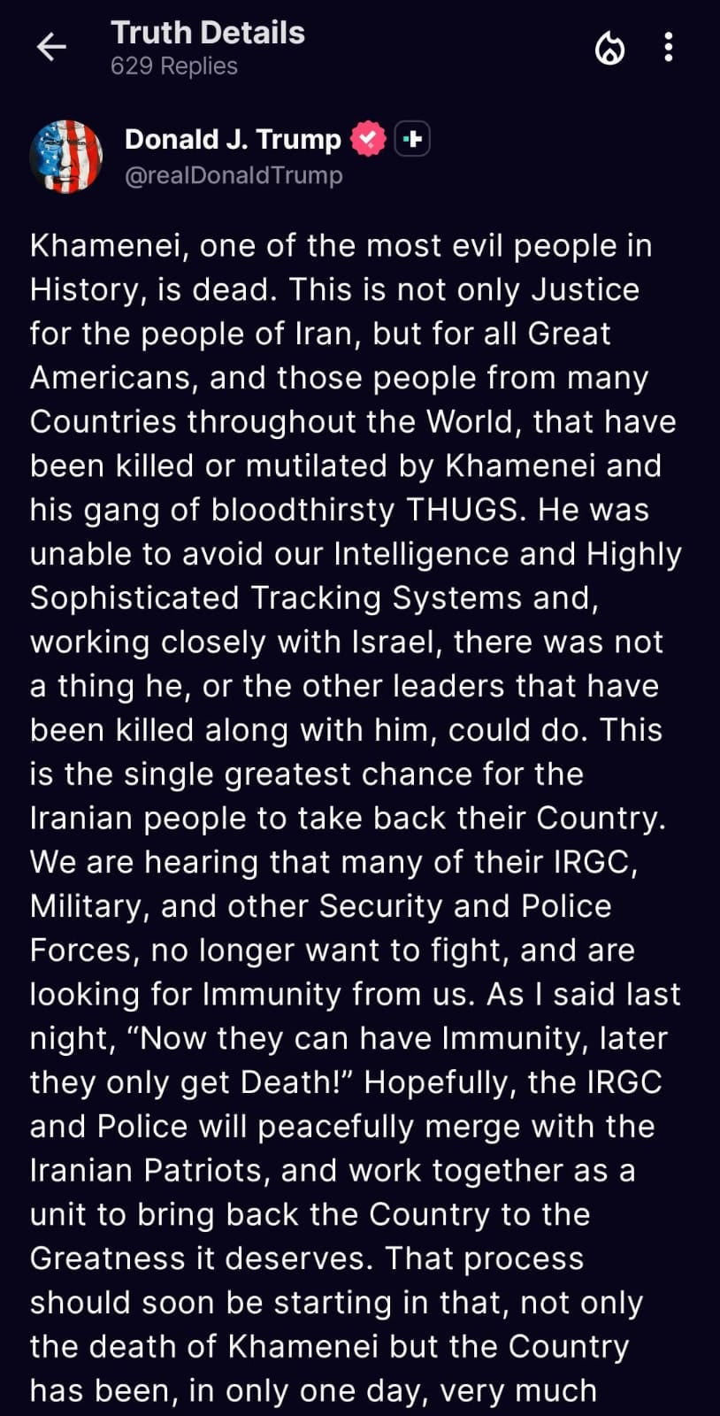 وأضاف ترامب أن ما جرى يمثل "أعظم فرصة للإيرانيين لاستعادة بلدهم"، لافتًا إلى أن معلومات تشير إلى أن العديد من عناصر الحرس الثوري والقوات العسكرية والأمنية "لم يعودوا يرغبون في القتال، ويبحثون عن حصانة".