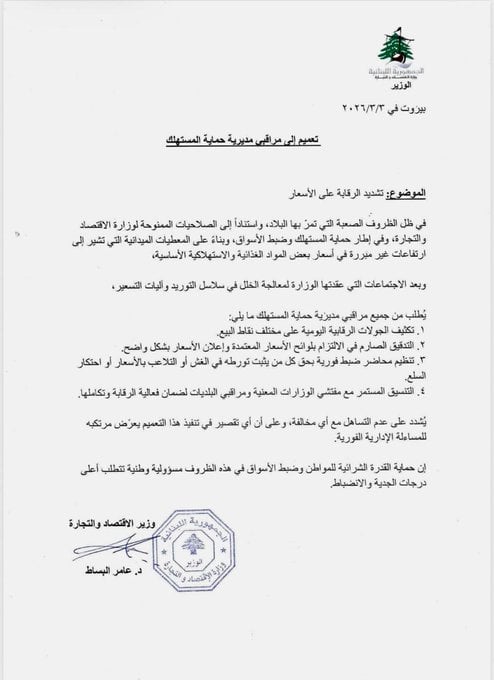 في ظلّ الظروف الاستثنائية التي تمرّ بها البلاد، أصدر وزير الاقتصاد والتجارة عامر البساط تعميمًا إلى مراقبي مديرية حماية المستهلك، دعا فيه إلى تشديد الرقابة على الأسعار وضبط الأسواق، ولا سيما في ما يتعلق بالمواد الغذائية والاستهلاكية الأساسية.
