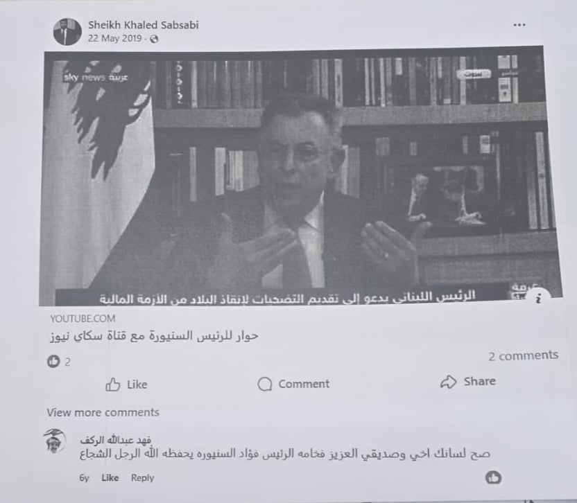 كما تظهر صفحات على مواقع التواصل الاجتماعي علاقة صداقة تجمع الركف بالرئيس السابق للحكومة فؤاد السنيورة، حيث يظهر في أحد المنشورات المتداولة وهو يصف السنيورة بـ”الأخ والصديق”، وقد أعاد الشيخ خالد السبسبي نشر هذا المنشور، فيما يعرض “ليبانون ديبايت” صورة له.