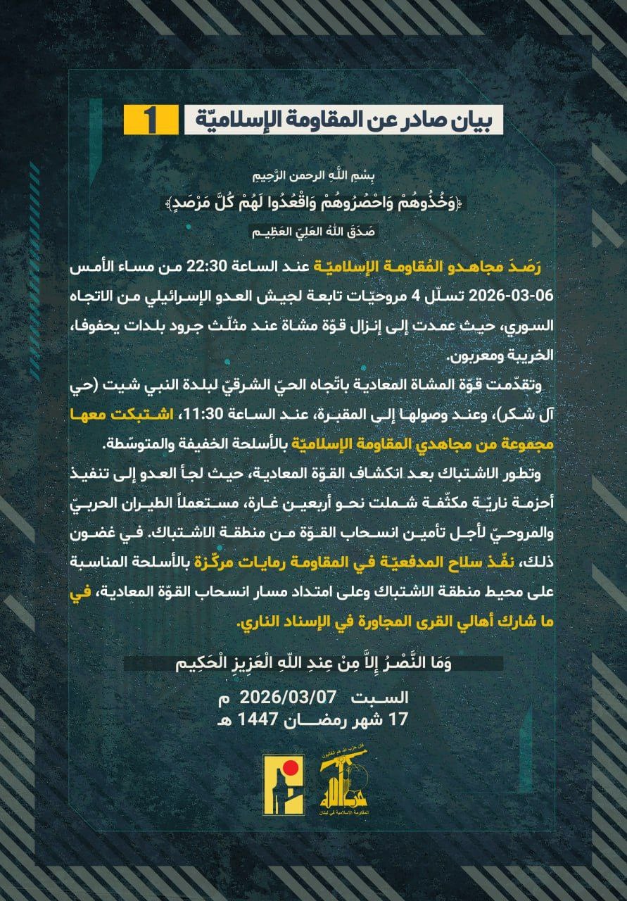 وفي بيان صادر عن المقاومة الإسلامية – حزب الله، أوضح الحزب أن مجاهديه رصدوا عند الساعة 22:30 من مساء الجمعة 06-03-2026 تسلل 4 مروحيات إسرائيلية من الجهة السورية، حيث نفذت عملية إنزال لقوة مشاة عند مثلث جرود بلدات يحفوفا والخريبة ومعربون.