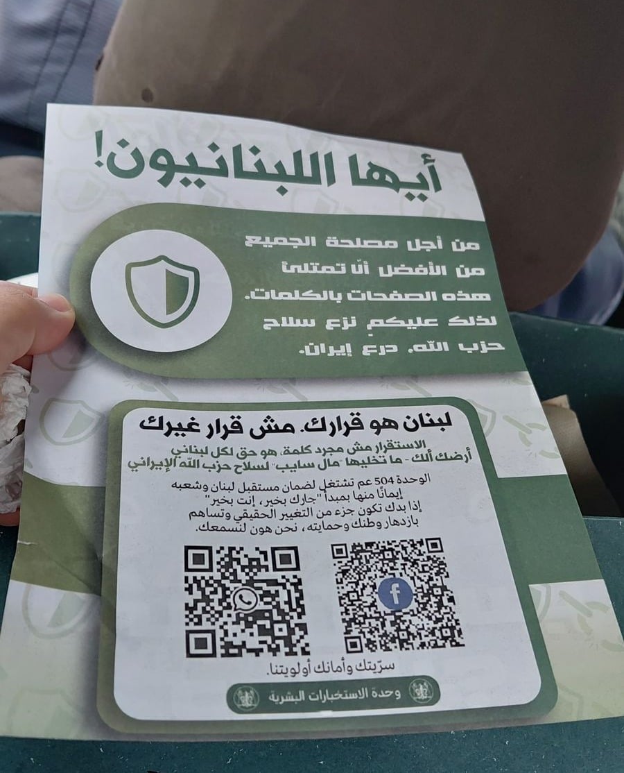 وأضاف المنشور أن "الوحدة 504 تعمل لضمان مستقبل لبنان وشعبه، إيماناً منها بمبدأ: جارُك بخير، أنت بخير"، داعياً من يريد أن يكون "جزءاً من التغيير الحقيقي ويساهم في ازدهار وطنه وحمايته" إلى التواصل عبر رموز QR وروابط إلكترونية تضمنها المنشور.