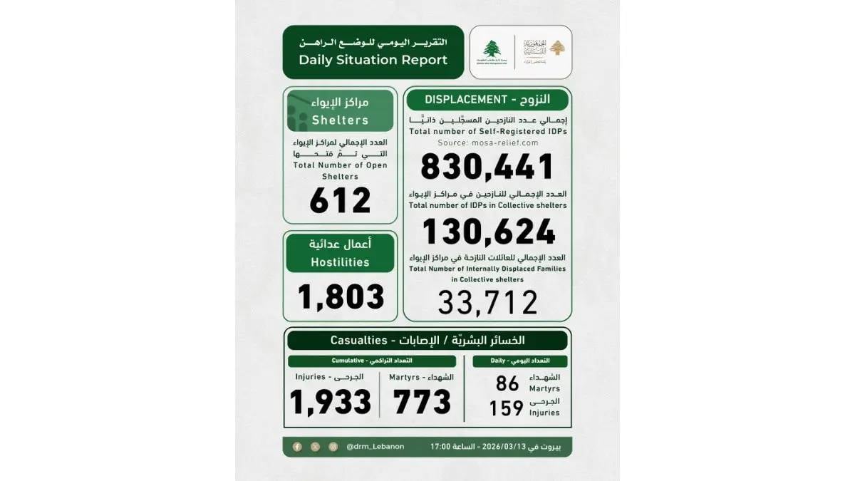 وتعكس هذه الأرقام اتساع موجة النزوح الداخلي نتيجة الغارات المتواصلة، حيث غادر مئات آلاف السكان من مناطق الجنوب والبقاع باتجاه مناطق أكثر أمناً في الداخل.