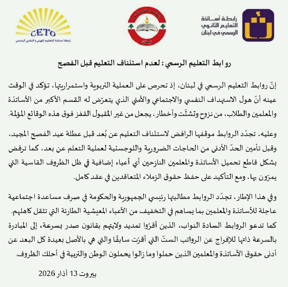 أعلنت روابط التعليم الرسمي في لبنان، في بيان صدر في بيروت بتاريخ 13 آذار 2026، رفضها استئناف التعليم عن بُعد قبل عطلة عيد الفصح، مؤكدة حرصها على استمرارية العملية التربوية، لكنها شددت على أن الظروف الراهنة لا تسمح بتجاوز الواقع الذي يعيشه الأساتذة والمعلمون والطلاب.
