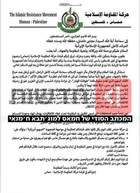 وبحسب تقرير للصحافي إليئور ليفي بثّته هيئة البث الإسرائيلية "كان"، أرسلت حماس خلال نهاية الأسبوع رسالتين إلى خامنئي: الأولى علنية ورسمية، والثانية سرية أخفت الحركة وجودها، قبل أن يُكشف مضمونها لأول مرة في نشرات القناة.