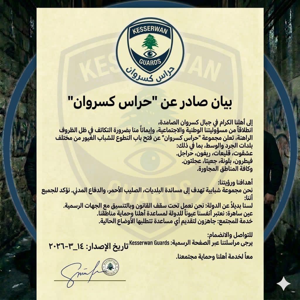 تداولت منصات التواصل الاجتماعي مؤخراً بياناً منسوباً لما يسمى جماعة "حراس كسروان"، يزعم أن هدفه دعم البلديات والصليب الأحمر والدفاع المدني في كسروان، وعرّفت المجموعة نفسها بأنها "عين ساهرة" تساعد الدولة وتحمي المجتمع المحلي، مؤكدة أنها تعمل تحت سقف القانون. لكن هذا البيان أثار ارتباكًا لدى السلطات المحلية وأدى إلى سلسلة توضيحات رسمية للتأكيد على أن أي نشاط أمني أو ميداني يجب أن يتم حصراً عبر القنوات الرسمية.