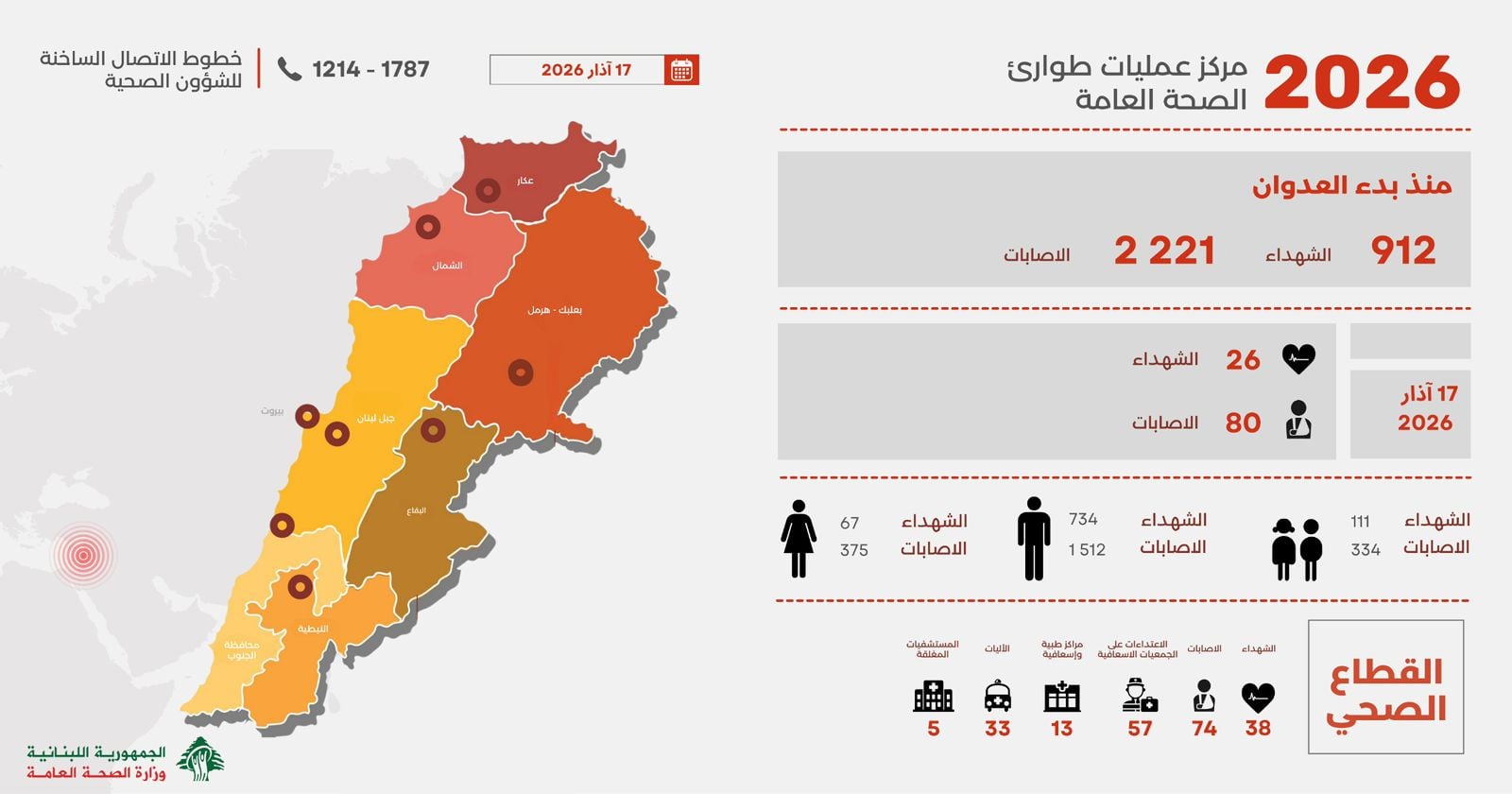 أعلنت وزارة الصحة العامة، في بيان صادر عن مركز عمليات طوارئ الصحة العامة، أن حصيلة ضحايا الغارات الإسرائيلية على لبنان منذ 2 آذار 2026 بلغت 912 شهيدًا و2221 مصابًا.