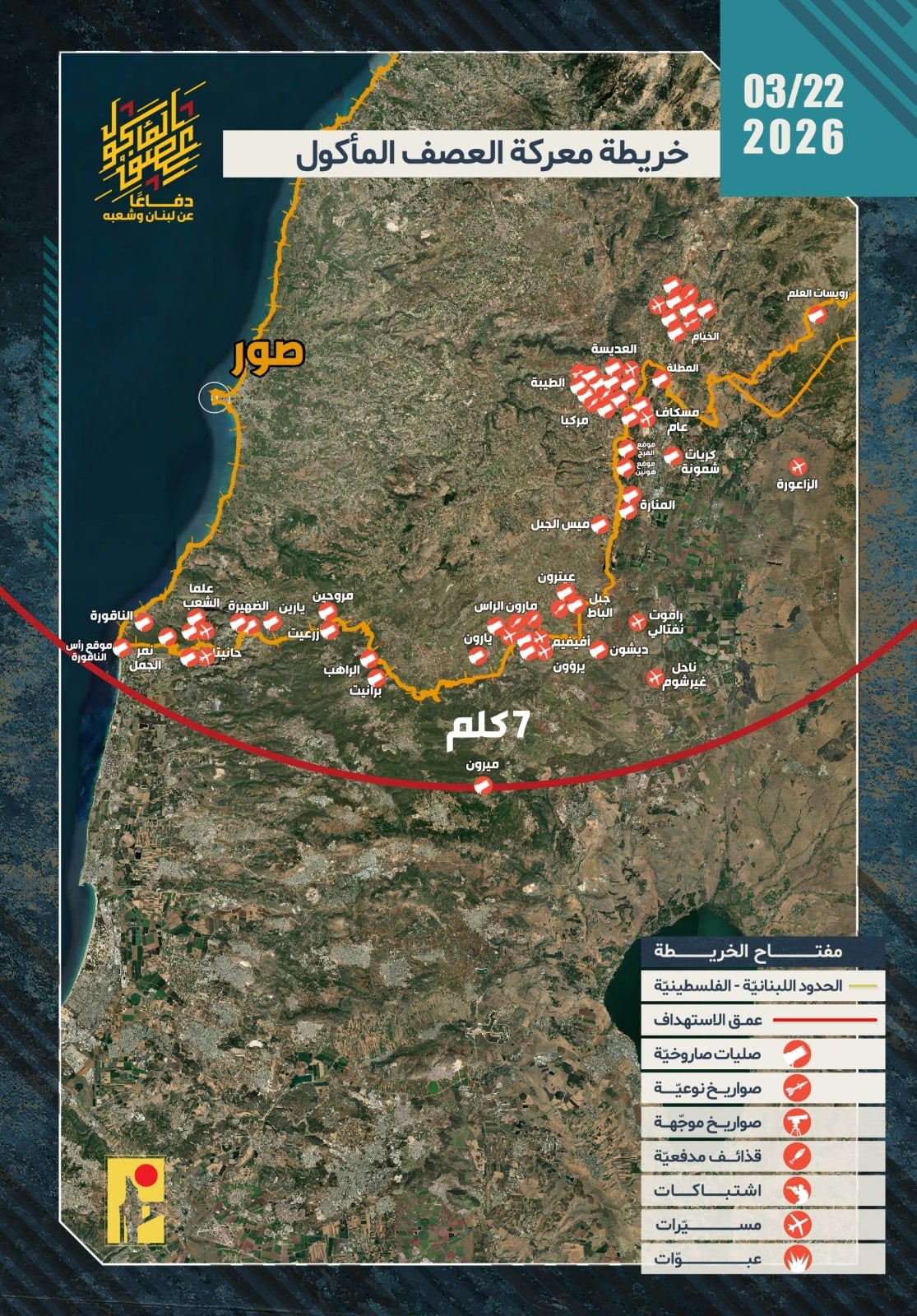 كما نشر الحزب صورة بعنوان: "وضعية عمليات المقاومة الإسلامية بتاريخ 22-3-2026"، توثق خريطة الانتشار والاستهدافات المعلنة خلال اليوم المذكور.